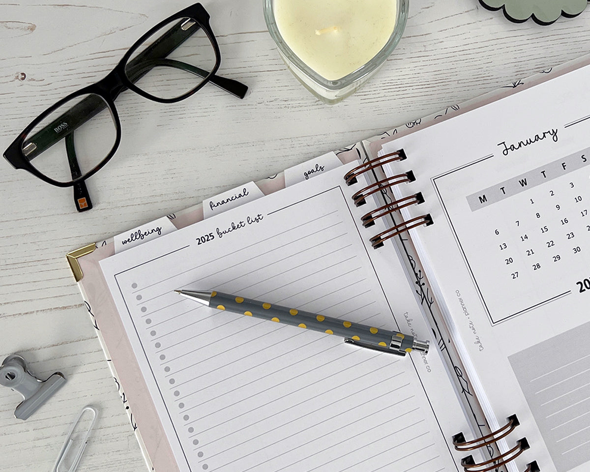 A comprehensive planner which includes goal setting worksheets, wellness & habit trackers, finance & budgeting spreads plus additional planning & review pages.