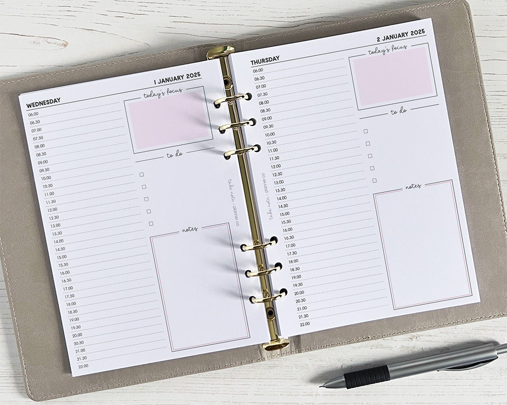 Daily planners dedicate an entire page to a single day and include a timed breakdown so you can easily make a note of your schedule, appointments and meetings. Not only perfect for people with very busy schedules, a daily layout can also be useful as a productivity tool, to time block your tasks over the course of the day.
