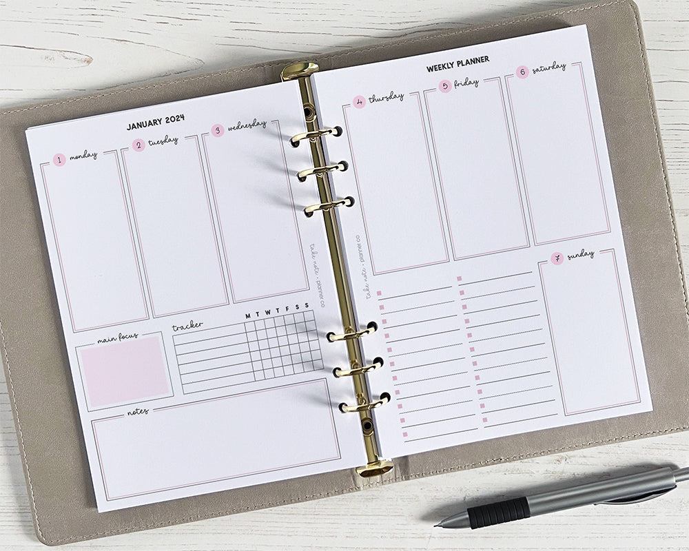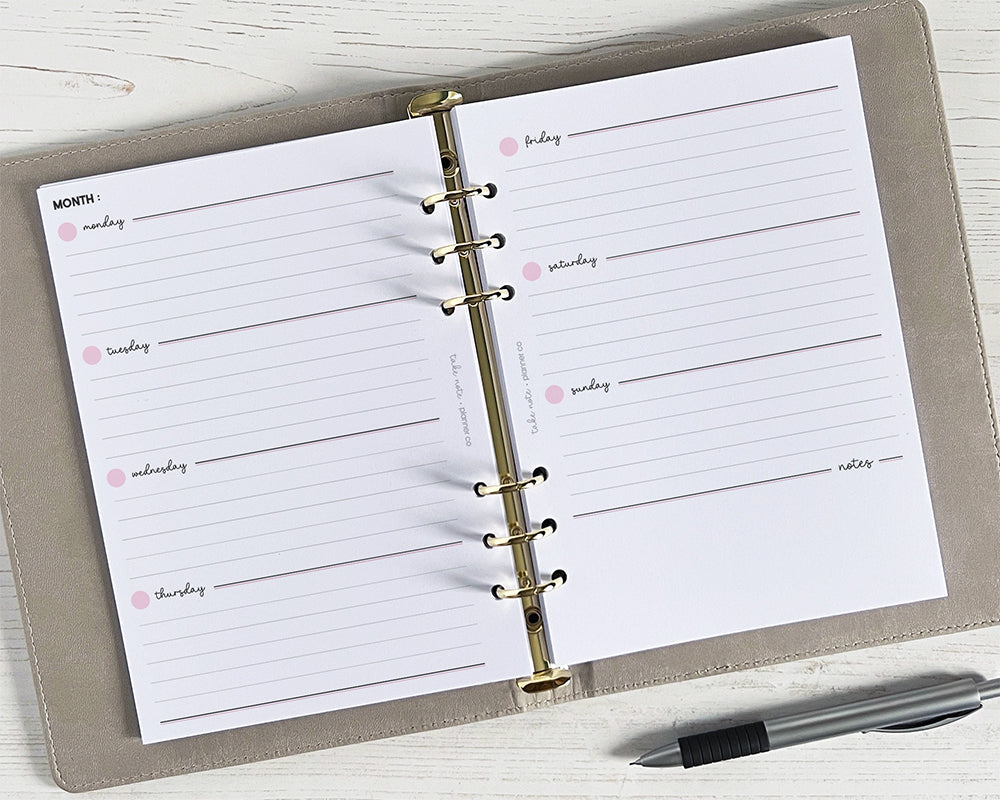 Inserts are used with A5 binders which have a 6 ring mechanism. The biggest benefit of this system is that you can build your own planner to suit your needs, adding a variety of inserts and reordering them as you wish.